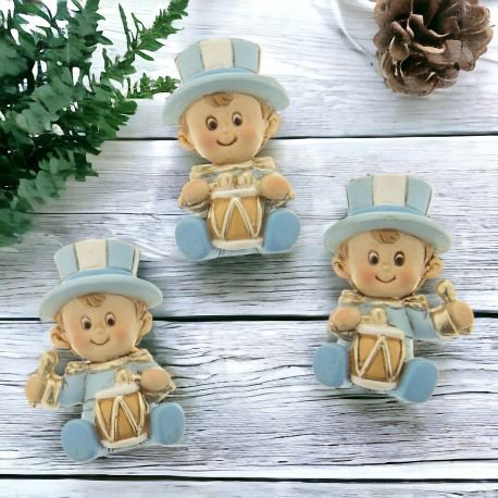I magneti bambino jolly con tamburello sono bomboniere che porteranno gioia e allegria ai tuoi eventi speciali. Realizzati in resina , questi adorabili magneti raffigurano un bimbo jolly seduto con un tamburello, indossando una tuta celeste con dettagli oro e un cappello a cilindro. Ogni magnete è assortito in varie posizioni, aggiungendo un tocco di unicità a ogni pezzo.